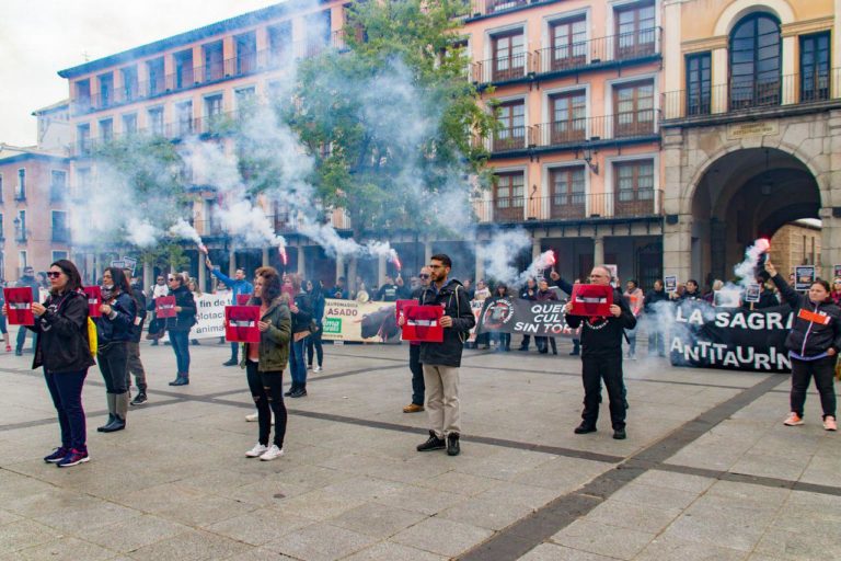 Los manifestantes han realizado una performance ya en la plaza de Zocodover, en la que se han encendido cinco bengalas, "cada una por los toros y vacas víctimas de cada provincia", señalaba Navas.