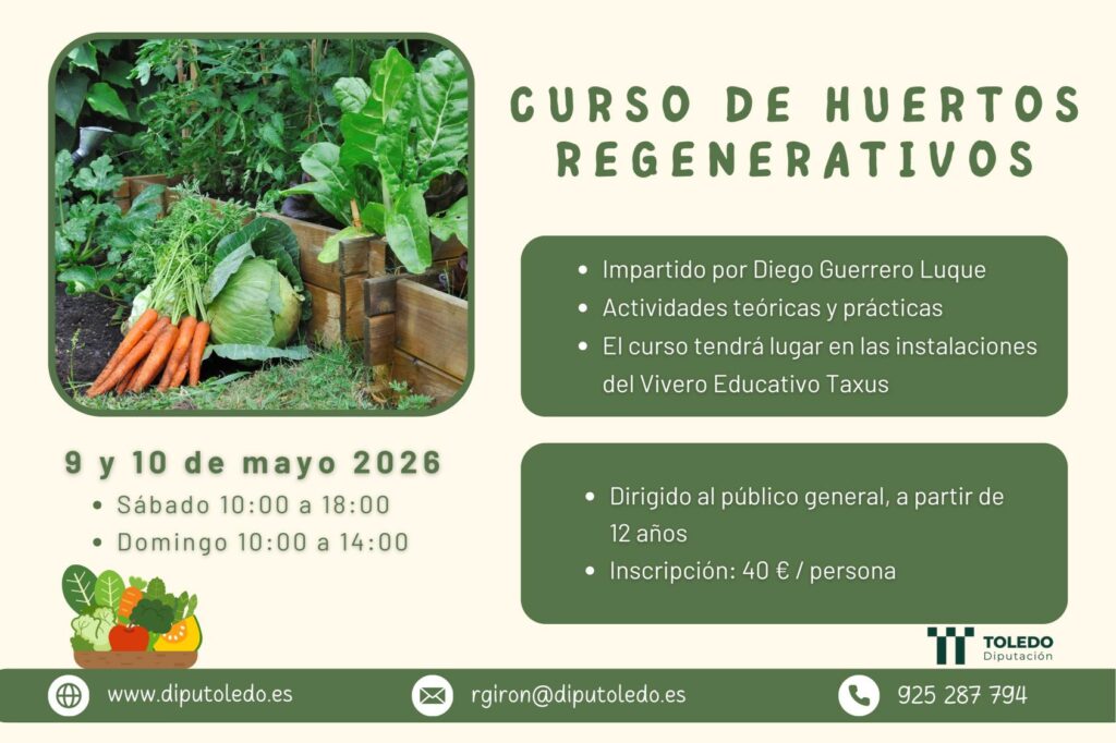 Los próximos 9 y 10 de mayo, el Vivero Educativo Taxus, dependiente de la Diputación de Toledo, será escenario de un curso sobre huertos regenerativos dirigido a personas interesadas en aprender a cultivar de manera respetuosa con el entorno y adaptada a pequeña escala.
