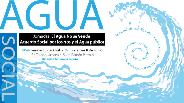 Bajo el título "El Agua no se Vende", Ganemos Toledo organiza unas jornadas para dar a conocer el Acuerdo Social por el agua y los ríos, un acuerdo que intenta poner el énfasis en la gestión sostenible medioambientalmente, pública y que dé prioridad a una planificación hidrológica que esté al servicio de los intereses de la sociedad como patrimonio ambiental público que es.