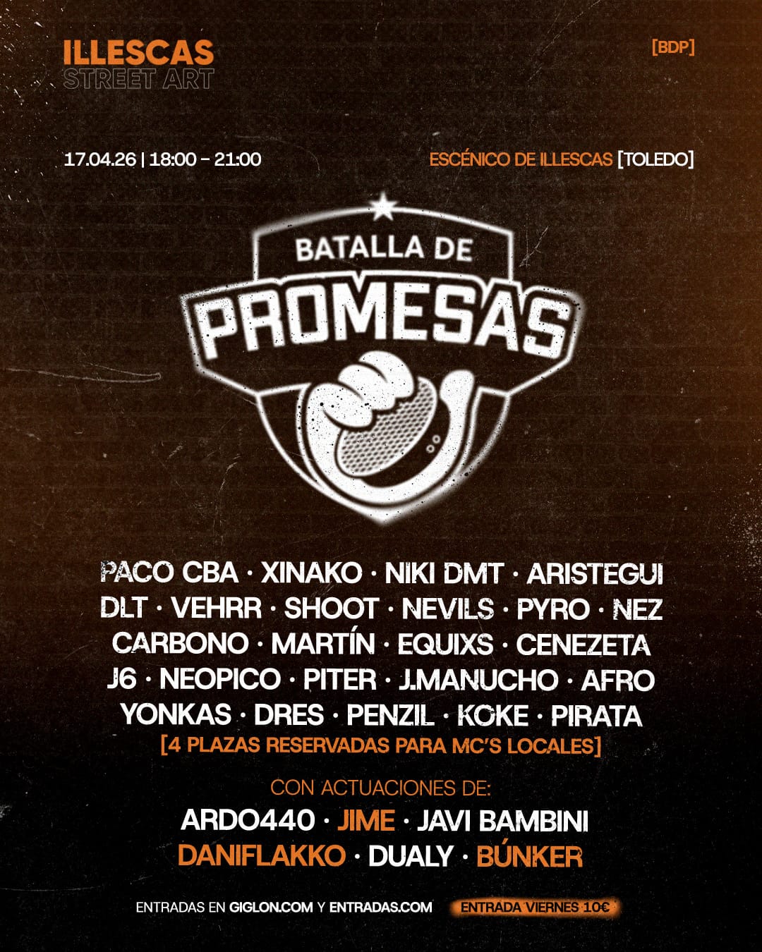 Y más allá de los conciertos, Illescas Street Art busca ser una experiencia completa. Un punto de encuentro para la juventud, la creatividad y la pasión por la cultura urbana. Habrá batallas de gallos cargadas de improvisación e ingenio, exhibiciones de breakdance y skate que aportarán dinamismo al evento y grafitis en directo que llenarán de color la localidad.