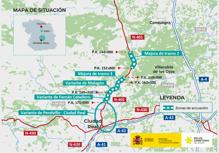 El Ministerio de Transportes y Movilidad Sostenible ha aprobado provisionalmente el estudio informativo para mejorar la carretera N-401, en el tramo entre la variante de Orgaz y la intersección de la carretera CM-4167 con la N-401 y Ciudad Real, en las provincias de Toledo y Ciudad Real. Este documento técnico será sometido a los trámites de información pública y de evaluación de impacto ambiental, cuyo anuncio correspondiente se publicará próximamente en el Boletín Oficial del Estado (BOE).