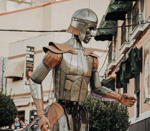 Aquiles se adentra en la ciudad con sus más de cinco metros de altura y sus casi 800kg recorriendo las calles y plazas e irrumpiendo en el día a día de la ciudad. Un espectáculo de enorme impacto visual que deja fascinados a todos aquellos que se acercan a ver cómo Aquiles camina por las calles.