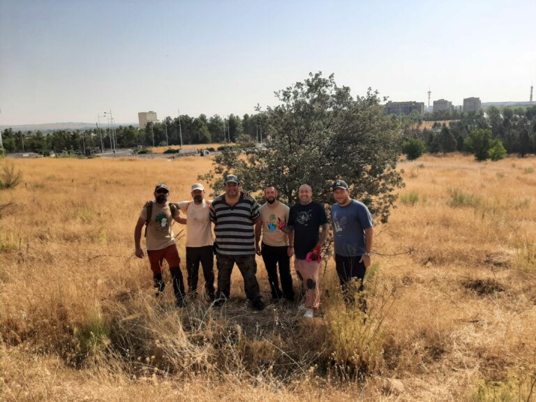 Un grupo de integrantes de la asociación se ha cobijado bajo una encina que crece en uno de los terrenos del parque periurbano Fuente del Moro que la asociación está reforestando para pedir la plantación de más árboles en la ciudad.
