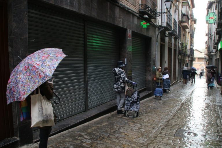 Impresionante imagen la de la cola para acudir al supermercado del Mercado Municipal de Toledo, que llegaba prácticamente al final de calle Tornerías. Se mantenía la distancia de seguridad, al igual que en el resto de los comercios, pero la afluencia era mucho mayor que en días anteriores del confinamiento.
