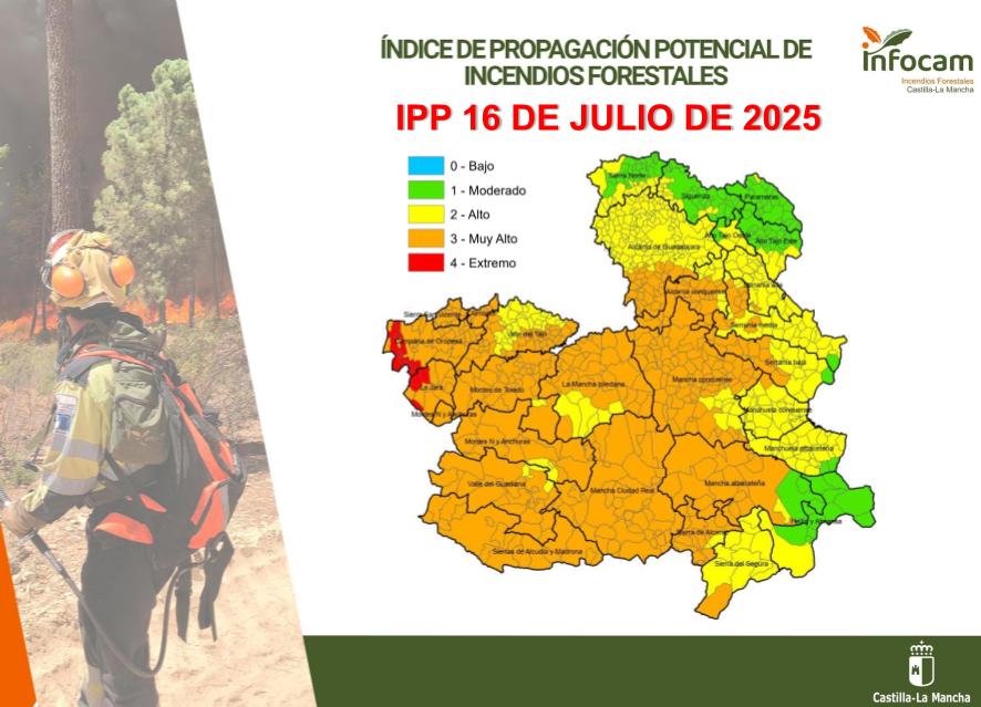El índice de propagación potencial de incendios (IPP) de este miércoles muestra zonas en rango 'extremo' en la provincia de Toledo, concretamente en la Campana de Oropesa y la zona de La Jara, mientras que en gran parte de la región es muy alto o alto. Aún se mantienen zonas en las que el índice muestra rangos moderados para la propagación potencial de incendios.