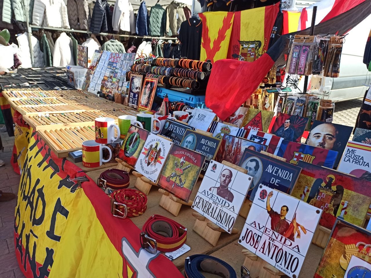 Así, además de los puestos de fruta, verdura, alimentos no perecederos, ropa u otro tipo de productos y artículos, quienes han transitado este martes por el mercadillo tenían la oportunidad de llevarse 'merchandising' con simbología franquista.