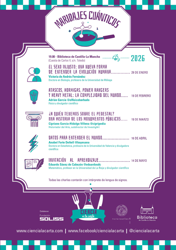 La Biblioteca de Castilla-La Mancha en Toledo acoge un año más el ciclo de Maridajes Cuánticos que arrancará el próximo 29 de enero. Esta edición incluye cinco charlas a cargo de ponentes de relevancia sobre biología, física, historia del arte, estadística y matemáticas, y que contarán con la intérprete de lengua de signos española, Ana María Manzano.