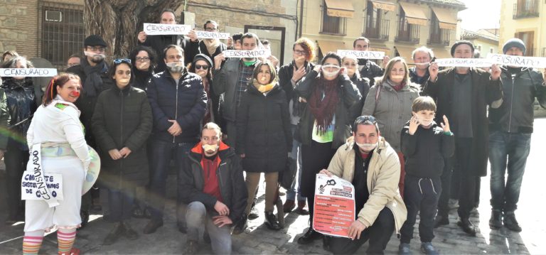Alrededor de medio centenar de personas, entre ciudadanos, artistas y poetas, se han concentrado en la Plaza del Ayuntamiento de Toledo en defensa de la libertad de expresión y contra las últimas sentencias judiciales en aplicación de la denominada 'Ley Mordaza'. Con ello, se han sumado a las movilizaciones en todo el país convocadas por los colectivos agrupados en la iniciativa #Hablamos? para denunciar la censura. En este caso, para mostrar su repulsa se han llevado a cabo varias actuaciones y 'performances', simulando lecturas y actuaciones de danza y música con las bocas, las manos o los ojos amordazados.