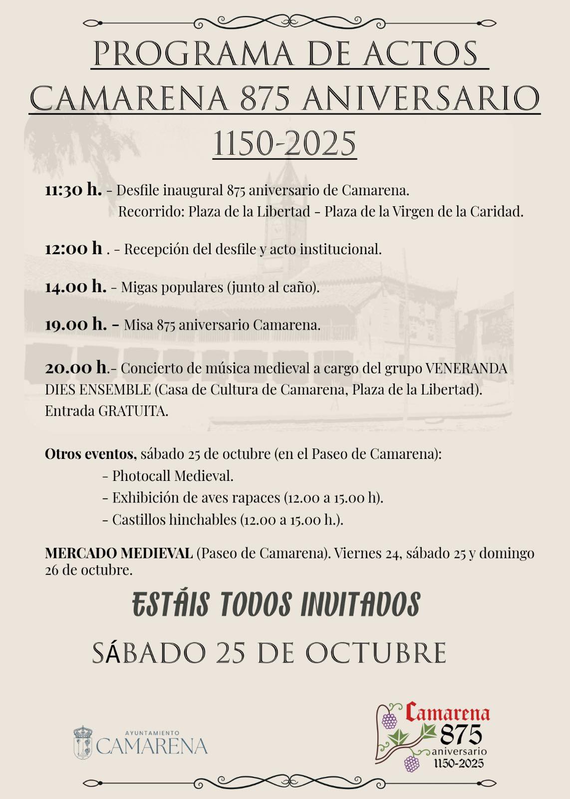 El desfile concluirá con los gigantes y cabezudos, parte inseparable de la identidad festiva camarenera, y con la Banda Sinfónica de Música de Camarena, dirigida por Sergio Ventura, que interpretará piezas tradicionales para cerrar este recorrido simbólico de 875 años de historia compartida.