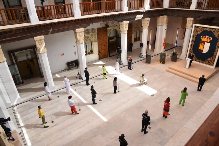 Ya el pasado 21 de abril se suspendieron los actos festivos del Día que Castilla-La Mancha. La celebración se pospone hasta 2021. Hoy solo tocaba el homenaje que iba desgranando una también emocionada conductora del acto en el patio del toledano Palacio de Fuensalida, con las medidas de seguridad correspondientes. Ni siquiera ha estado presente todo el Gobierno regional.