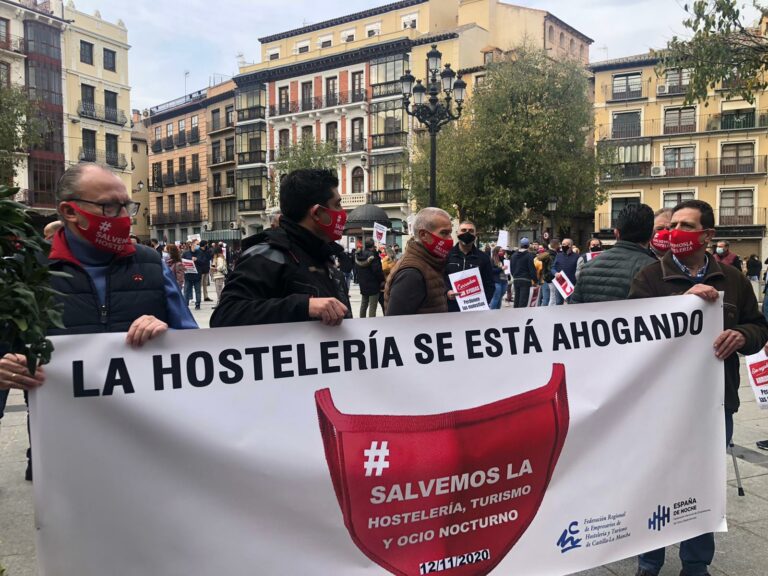 Alrededor de 800 hosteleros llegados de toda la provincia de Toledo se han manifestado por las calles de la capital regional y ante las sedes de la administración local, regional y nacional con pancarta y gritando lemas en los que solicitaban ayudas a todas ellas para rescatar un sector que “está muriendo”.