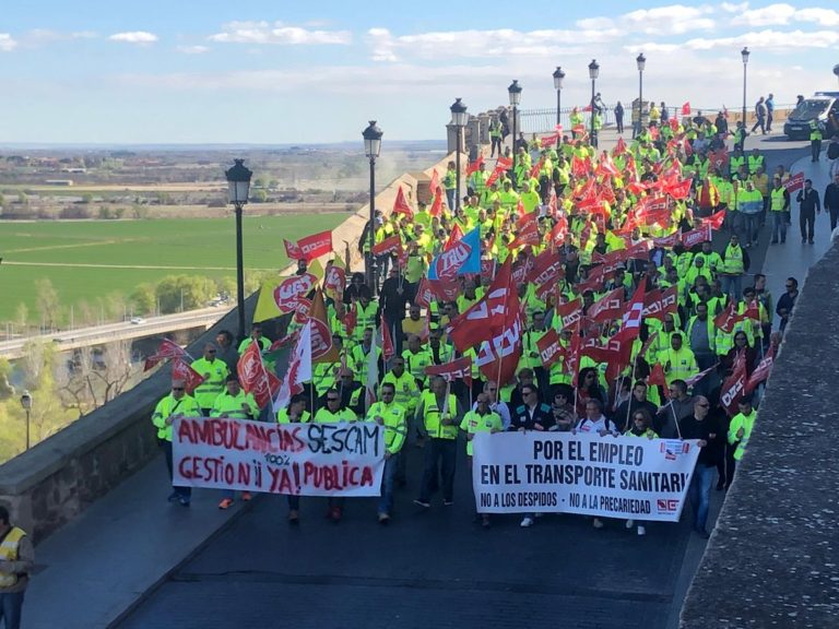 Unos trescientos trabajadores de las ambulancias de Castilla-La Mancha convocados por UGT y CCOO Castilla-La Mancha se han manifestado en Toledo desde la Plaza de Zocodover hasta la Plaza de Toros para exigir la vuelta a las negociaciones del convenio de transporte sanitario de ambulancias y denunciar las condiciones que el colectivo "lleva soportando" desde 2012.