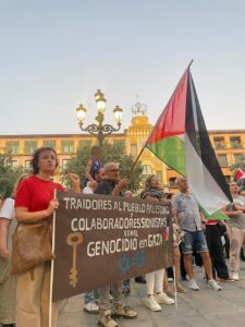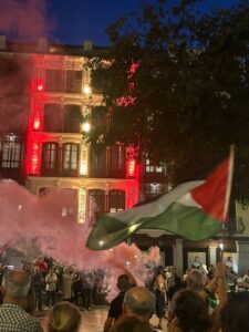 - Concentración en la plaza de Zocodover (Toledo) por la ‘Flotilla de Gaza’, en cuya pancarta se lee «Desde el río hasta el mar, Palestina vencerá». Imagen: Itziar Machicado.