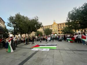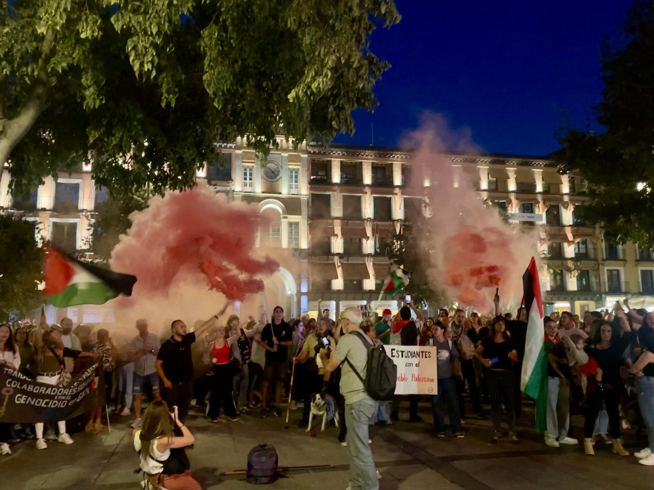 En una plaza de Zocodover repleta, con banderas palestinas, bengalas y pancartas denunciando el genocidio se ha pedido "boicot a Israel" y se ha cantando con optimismo: "Las tierras robadas serán recuperadas". Las proclamas no han cesado durante más de una hora bajo la atenta mirada de los efectivos policiales desplegados.