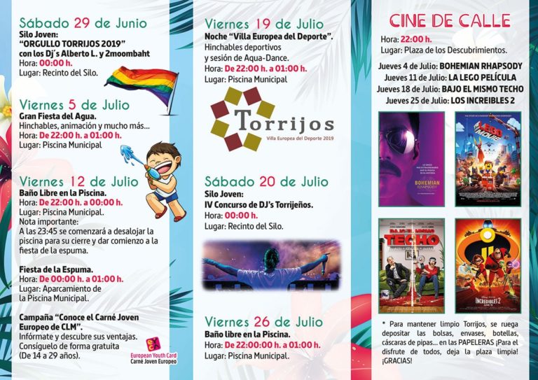 Por último, cabe señalar que para inscribirse en el Concurso de Dj´s torrijeños, hay que hacerlo hasta el 15 de julio en el Centro de Información Juvenil. En cuanto a las sesiones de piscina nocturna, esta tendrá un coste de 1 euro para personas de 15 años de edad en adelante, 0,50 euros para niños de 4 a 14 años y titulares del Carné Joven Europeo de CLM y Carné del Centro Joven, y gratis para niños de 0 a 3 años.