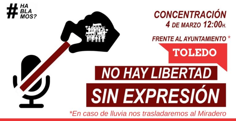 Un nutrido grupo de ciudadanos, activistas, poetas, artistas y periodistas han convocado para el próximo domingo, día 4 de marzo, una jornada reivindicativa en Toledo para defender la libertad de expresión frente a los “terribles” acontecimientos acontecidos en las últimas semanas por la aplicación de la denominada Ley Mordaza y las sucesivas multas y condenas derivadas de su aplicación. Estos actos se enmarcan dentro del llamamiento a las movilizaciones en todo el país que han realizado los colectivos enmarcados en la iniciativa #Hablamos? contra la censura.