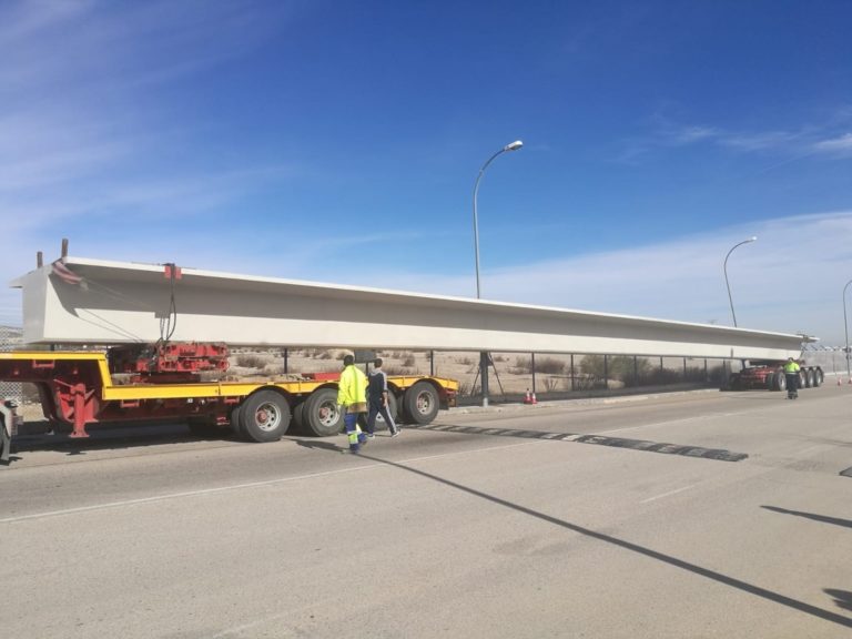 Las vigas de hormigón pretensado llegarán en transporte especial por carretera. Cada una de ellas pesa entre 30 y 100 toneladas, en función de su tamaño. La pasarela sobre el AVE tiene una sola luz y una longitud de 41 metros, mientras que la que salvará la R-4 está compuesta por tres vanos de 15, 43 y 15 metros, cada uno.