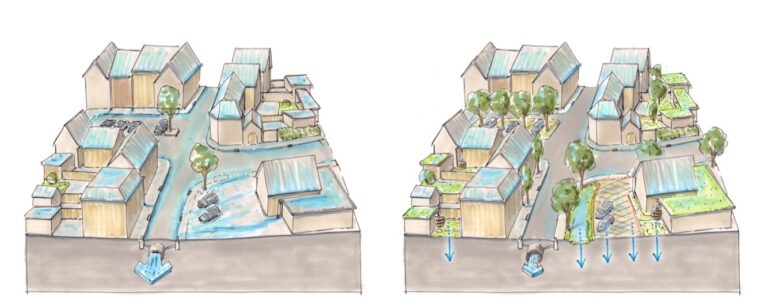 En el ámbito urbano, se puede contribuir en buena medida a la reducción del riesgo de inundación haciendo las ciudades más permeables. La creación de más zonas verdes, la sustitución de pavimentos impermeables por otros capaces de drenar, el aprovechamiento del agua que recogen los tejados, patios particulares, etc., permiten reducir el agua que circula en superficie y en las redes de alcantarillado, contribuyendo así a la reducción de la posibilidad de inundaciones propias en este ámbito.