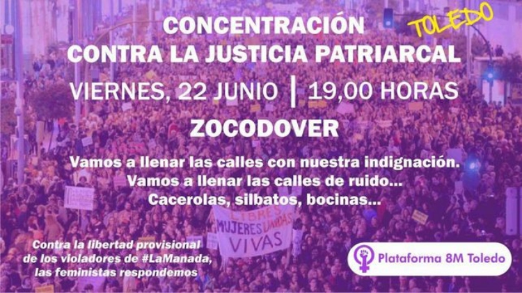 En Toledo, se hace un llamamiento para este viernes 22 de junio a las 19 horas, en la plaza de Zocodover 'Contra la justicia patriarcal' y se insta a "llenar las calles con nuestra indignación" en una convocatoria de la Plataforma 8M de la capital regional.