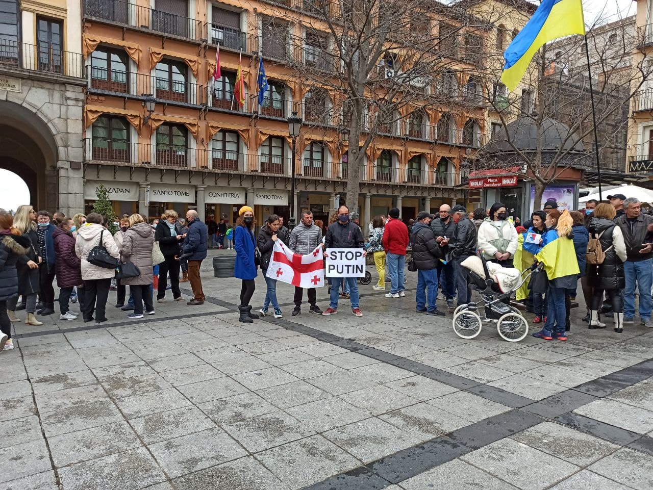 En Toledo medio centenar de personas se han concentrado este sábado en la plaza de Zocodover como acto de protesta por la invasión rusa a Ucrania. El colectivo Mujeres de Negro contra la Guerra de Toledo había convocado esta movilización para pedir una gestión pacífica del conflicto y a ella se han sumado ciudadanos y ciudadanas ucranianas residentes en la ciudad.
