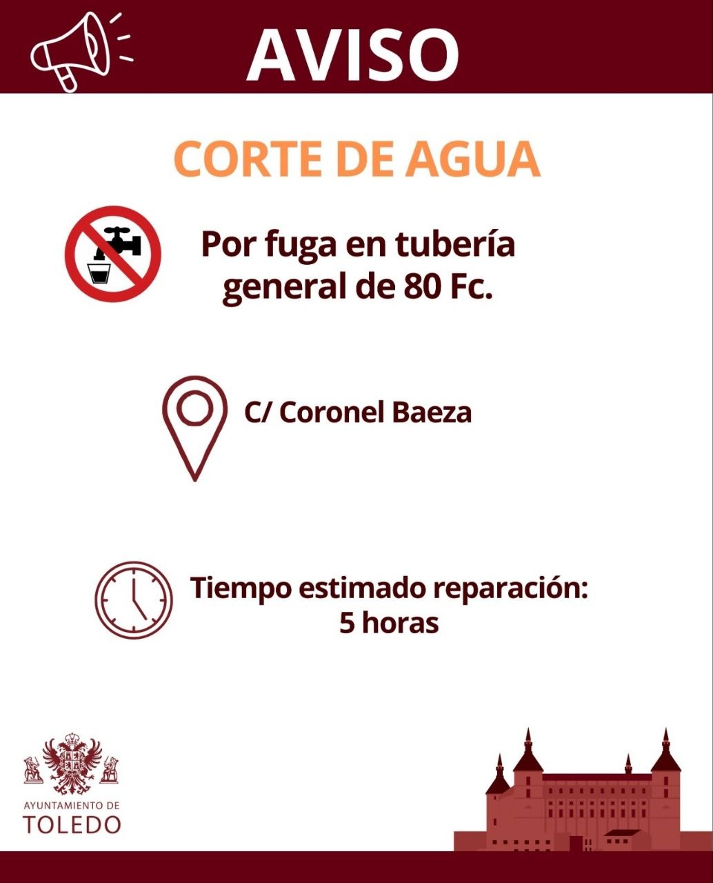 El Ayuntamiento de Toledo ha informado de un corte de agua que afecta a la calle Coronel Baeza debido a una fuga en una tubería general cuya tiempo de reparación se estima en unas 5 horas.