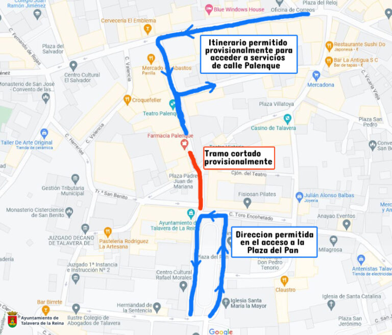 El Ayuntamiento de Talavera informa que, a partir de este lunes, 13 de marzo, se mantendrá cortado al tráfico el tramo de la plaza Padre Juan de Mariana que comunica la plaza del Pan y con la calle Palenque. Esta interrupción a la circulación por esta zona será provisional, hasta finales del mes de marzo, y se realiza con motivo del avance de las obras de adecuación y accesibilidad en la plaza.