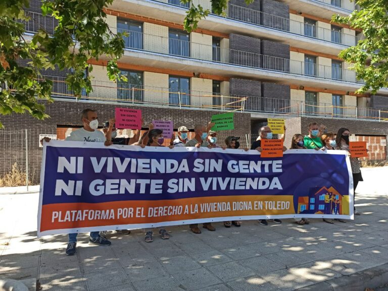 Integrada por varias asociaciones y entidades de la población civil de Toledo, la plataforma hizo su puesta de largo frente a este edificio que consideran "un símbolo" del "cúmulo de irregularidades y despropósitos de las administraciones públicas" pues actualment se mantiene, según los datos que han recopilado, un listado de 2.715 demandantes de vivienda en la ciudad de Toledo.
