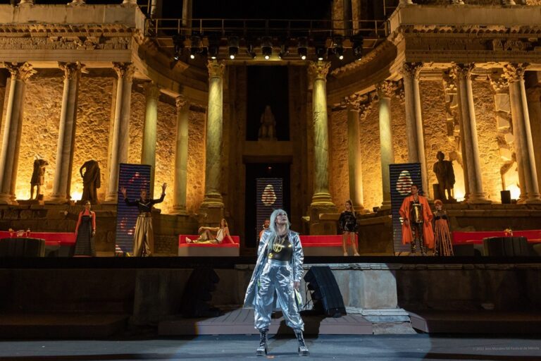 En total en la obra se escuchan 19 canciones que te van contando la historia. Hay rock, tangos, ritmos modernos muy divertidos… es una banda sonora con mucha personalidad que se reproducirá semi en directo teniendo en cuenta las condiciones de Mérida. un teatro romano, antiguo, al aire libre, con capacidad para tres mil espectadores… es muy difícil sonorizar bien, por eso muchos instrumentos están grabados.