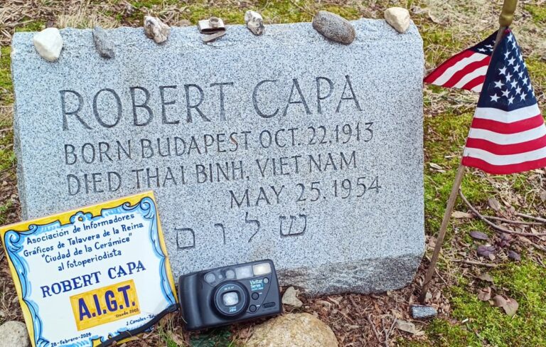 Una placa de cerámica talaverana reposa desde hace unos días en la tumba del icónico fotoperiodista Robert Capa, cuyos restos se encuentran en el cementerio de la localidad de Amawalk, en Nueva York. Es probablemente el único homenaje que se ha hecho al reportero de guerra en su tumba desde España, y la iniciativa ha venido de una “modesta” asociación. Se trata de la Asociación de Informadores Gráficos de Talavera de la Reina, que ha depositado el azulejo en la tumba de Capa con motivo del 70 aniversario de su muerte. Se trata de un azulejo elaborado artesanalmente por el ceramista Justo Canales y que se distingue por los colores típicamente talaveranos, blanco y azul.