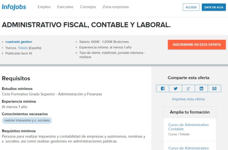 Aparentemente se trata de una oferta de empleo más en el conocido portal de Infojobs. Un puesto vacante de administrativo fiscal, contable y auxiliar para una empresa en la localidad de Yuncos (Toledo), con horario de 8.30 a 16.00 horas y un sueldo de entre 600 y 1.200 euros brutos al mes.