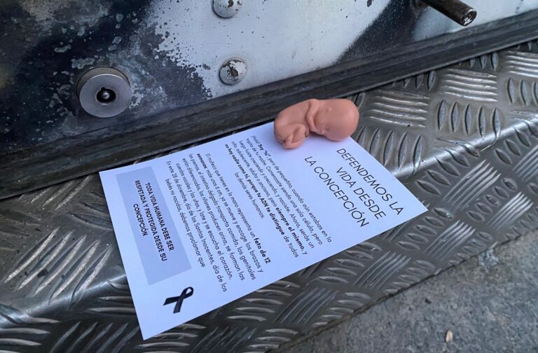 “El muñeco que tienes en la mano representa un feto de 12 semanas: mide unos 6 centímetros, ya se mueve y encoge los brazos y las piernas, el intestino delgado transporta comida, los genitales están diferenciados, los riñones producen orina, se forman las cuerdas vocales y las uñas, y late y se escucha el corazón”, continúa el folleto. “En este 28 de diciembre, día de los Santos Inocentes, día de los bebés no nacidos, debemos proclamar que toda vida humana debe ser respetada y protegida desde su concepción”, finaliza la propaganda contra el aborto repartida por Toledo.