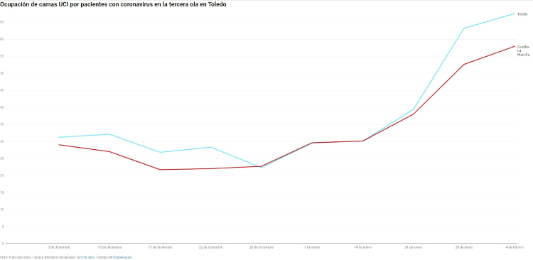 La provincia de Toledo tampoco es ajena a la situación, y de hecho presenta los peores datos tras Guadalajara. Los hospitales toledanos comienzan febrero con una ocupación de pacientes COVID-19 en camas UCI de un 67.5%, la cifra más alta que se ha alcanzado en la provincia que ya de por sí ha mostrado cifras muy por encima de la media en las últimas semanas. Del 21 al 28 de enero se produjo el mayor crecimiento entre los centros toledanos, pasando de una ocupación del 39.4% al 63.2%.
