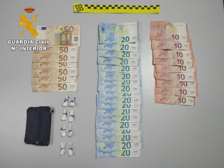 El segundo delincuente fue detenido días después al ser sorprendido por la Guardia Civil haciendo una venta dentro de un vehículo, donde se le incautaron 7 gramos de cocaína fraccionados en dosis y 800 euros.
