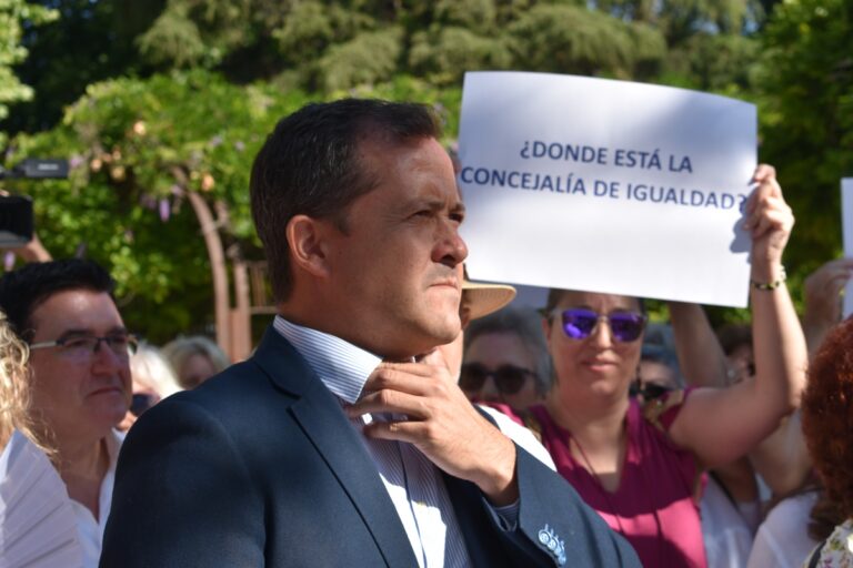 Medio centenar de personas ha asistido a esta concentración, muchas de ellas integrantes de la protesta paralela, en cuyo manifiesto el alcalde ha asegurado que las políticas de igualdad se confirman con hechos. “Protestamos por su pacto con Vox y por eliminar la concejalía, estos son los hechos, hechos que son un retroceso y retrógrados”, subrayaba García.