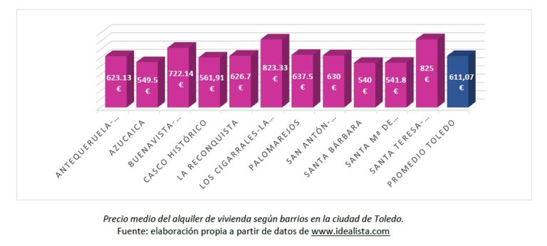 El precio promedio de una vivienda de alquiler en Toledo es de 611,07 euros al mes. Por barrios, la zona con precio medio de alquiler más cara sería la de Santa Teresa-Vistahermosa, con 875 euros/mes de precio. Después estaría la zona de Los Cigarrales-La Bastida, con un precio medio de 823,33 euros/mes. Ambos sectores de la ciudad, indica el informe, se alternan los precios más caros debido al gran tamaño de sus viviendas, algunas de las cuales alcanza los 2000 euros/mes.