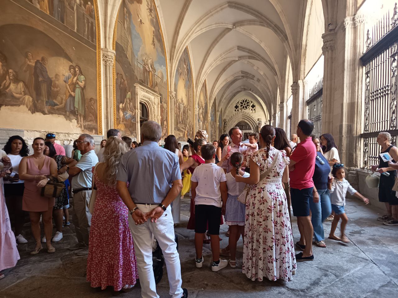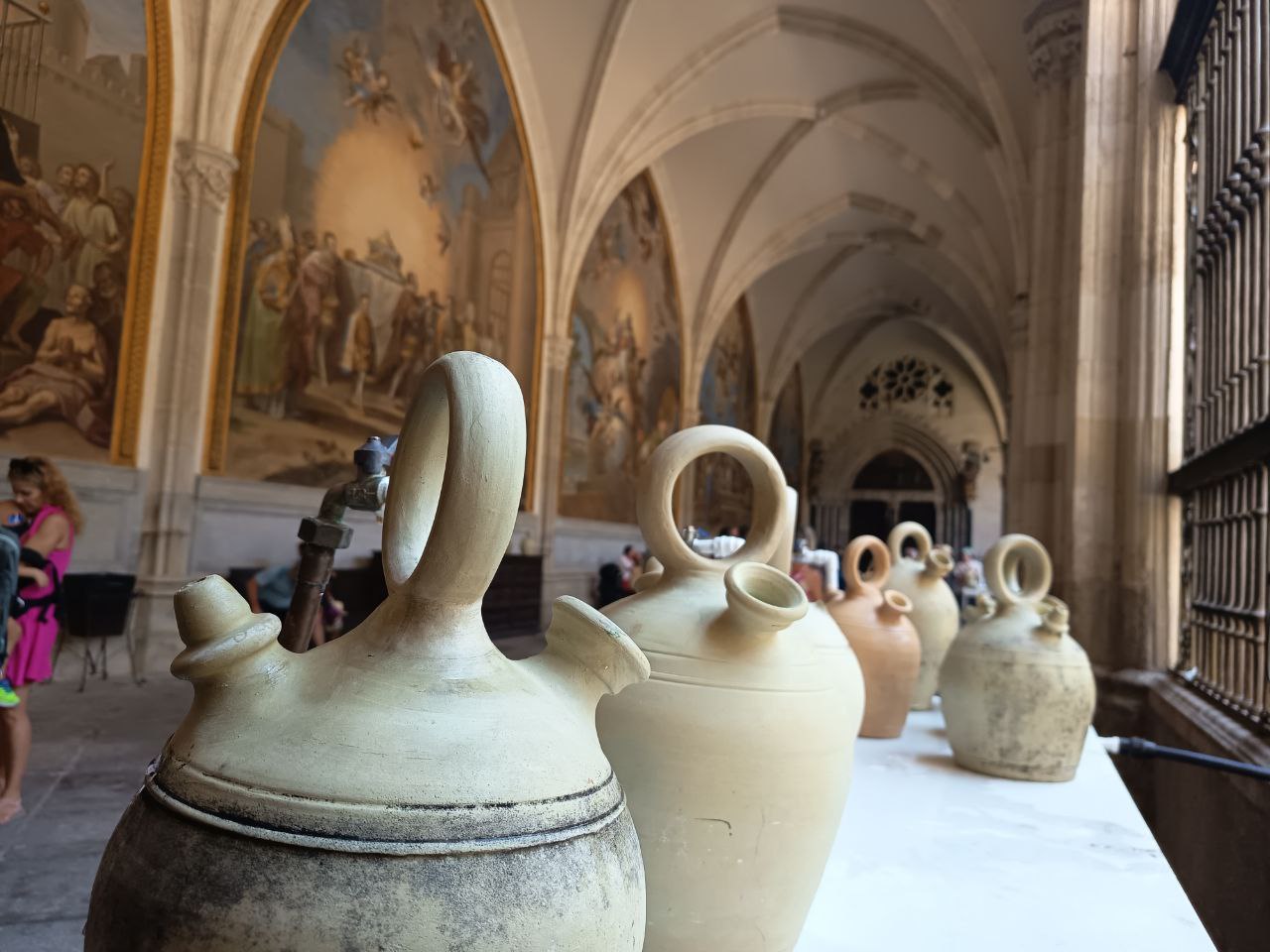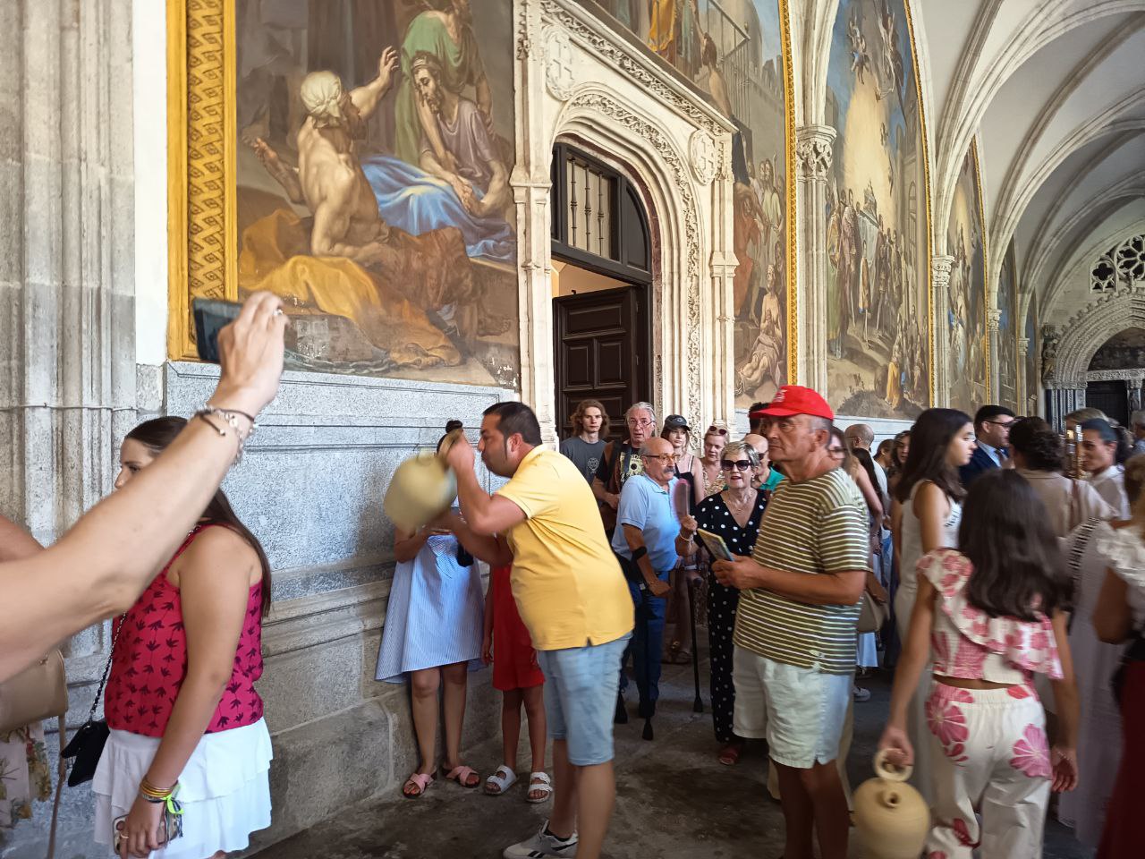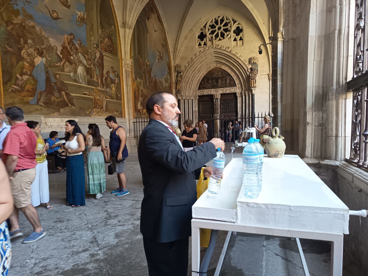 Las altas temperaturas no han frenado a los cientos de toledanos, toledanas y visitantes que han acudido a celebrar a la patrona de la ciudad, la Virgen del Sagrario, con la querida tradición de beber 'agua de la Virgen' de los botijos dispuestos para ello en el claustro de la Catedral.