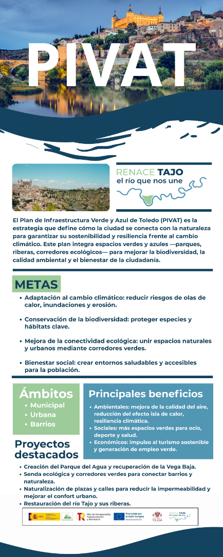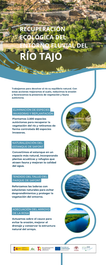 La exposición itinerante ofrece un recorrido informativo y visual que incluye contenidos explicativos sobre el proyecto 'Renace Tajo', una selección de fotografías históricas que muestran la relación de Toledo con el río a lo largo del tiempo, así como información específica sobre el Plan de Infraestructuras Verde y Azul de Toledo (Pivat), instrumento "clave" para la planificación y gestión del entorno fluvial.