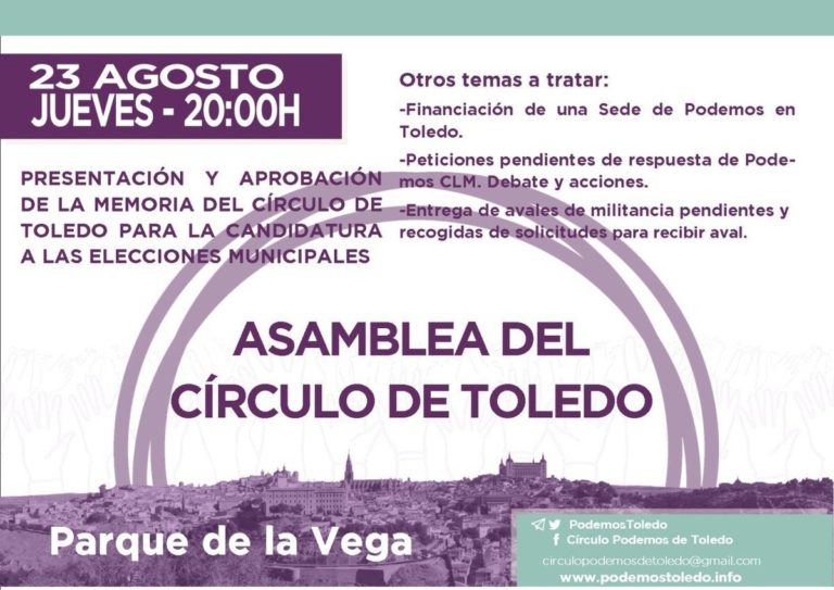 El Círculo Podemos de Toledo celebrará su próxima Asamblea Ordinaria este próximo jueves 23 de agosto, a partir de las 20.00 horas, en el Parque de la Vega, con un orden del día en el que destaca la presentación y aprobación de los documentos del Grupo de Trabajo Municipalista de cara a presentar la candidatura a las próximas Elecciones Municipales.