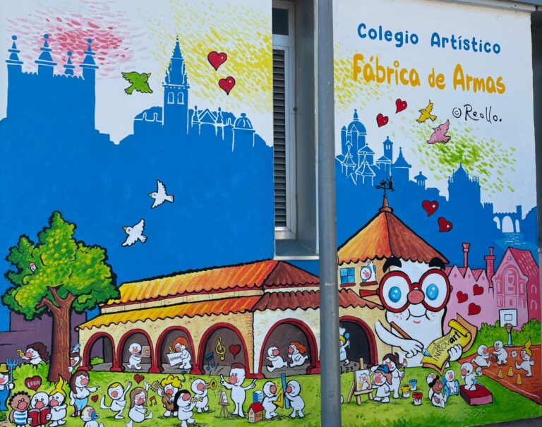 El CEIP Fábrica de Armas ha inaugurado un mural de Toni Reollo, "una obra de arte que decora una de las fachadas del centro educativo con el estilo "peculiar y colorido" del pintor toledano, que refleja las distintas disciplinas que contribuyen a que este colegio sea el único considerado ‘artístico’ en la ciudad.