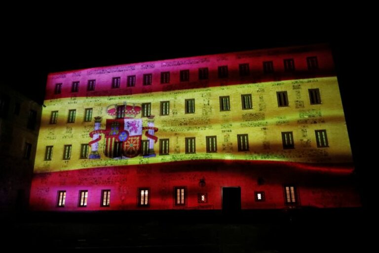 Este viernes se hacían las pruebas de la espectacular iluminación que durante las noches del sábado 5, domingo 6 y lunes 7 de diciembre podrá admirarse en la fachada de la sede del Parlamento, una gran imagen en movimiento de la bandera española con su escudo que ocupa la totalidad de esta pared principal y que es visible desde otros puntos más alejados de la ciudad.