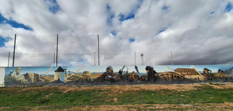 La obra de Consuegra, de 60 metros de largo y 2,7 de altura, resume la historia del municipio toledano desde su pasado romano. Se sitúa en una pared del campo de fútbol que da al río Amarguillo, que se ha desbordado varias veces generando episodios dramáticos.