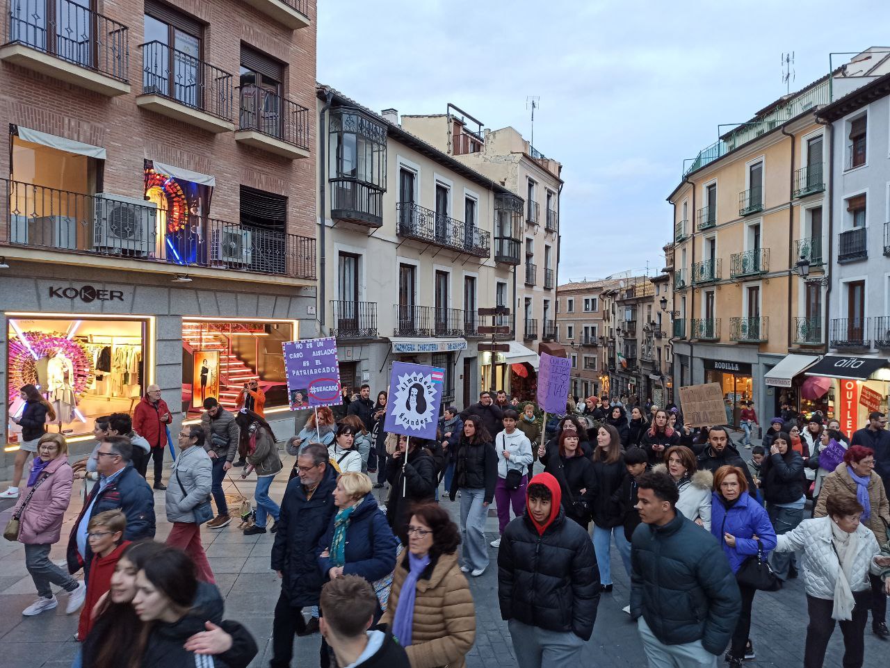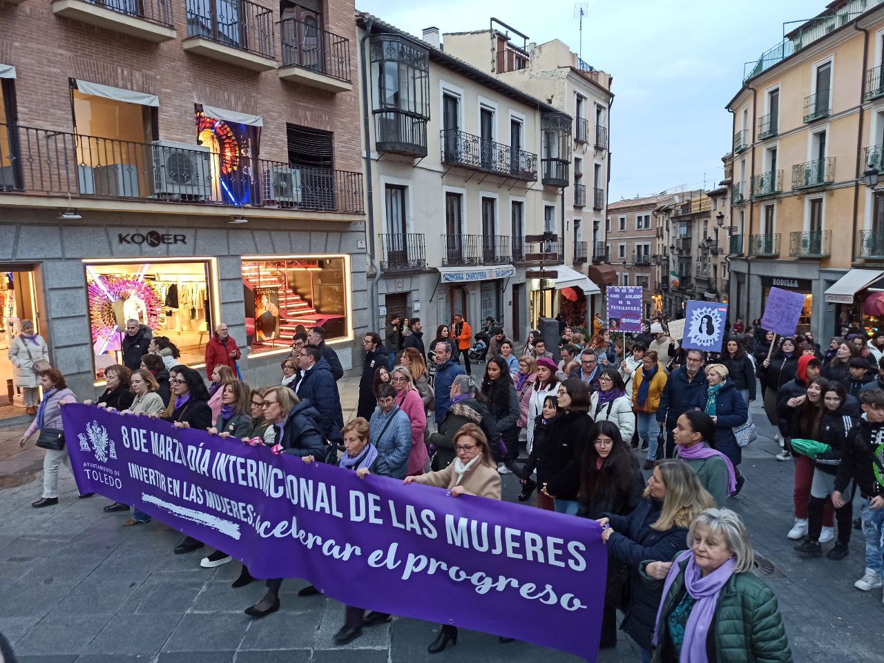 Centenares de toledanos y toledanas, jóvenes, mayores y también muchos niños y niñas en comparación con años anteriores, han salido a la calle este 8M para volver a reivindicar una vez más derechos y libertades para las mujeres. De nuevo, la cita ha estado protagonizada por la división entre dos manifestaciones: la convocada por el Consejo Local de la Mujer y la que ha impulsado la Plataforma 8M Toledo.