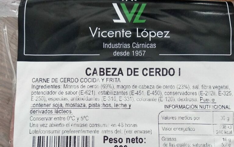 El Departamento de Salud del Gobierno Vasco ha retirado de la venta e inmovilizado un lote de cabeza de cerdo marca Vicente López, elaborado por Industrias Cárnicas Tello SA, localizada en la localidad de Totanés, por contaminación de listeria.