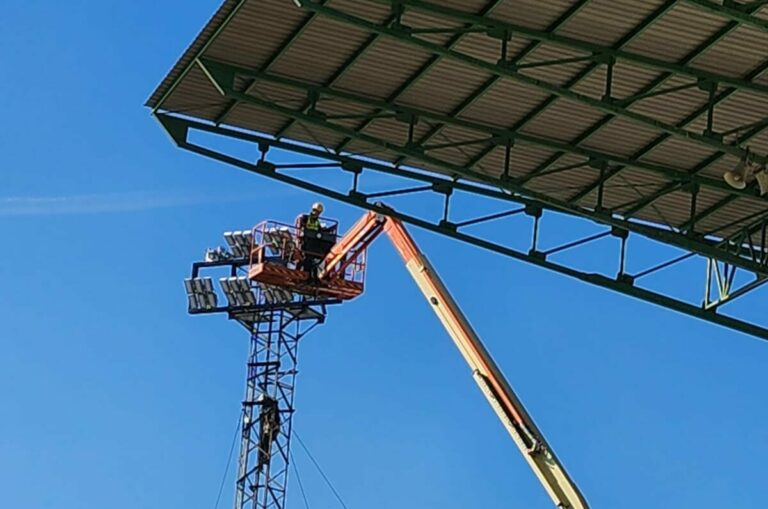 "Hemos renovado la luminaria con luces led con las que el Club ahorrará hasta un 80% en su factura de la luz", concretan desde Ibenergi sobre luminaria que estará en pruebas los próximos días y podría inaugurarse este mes de marzo una vez se han instalado las torres y los focos.