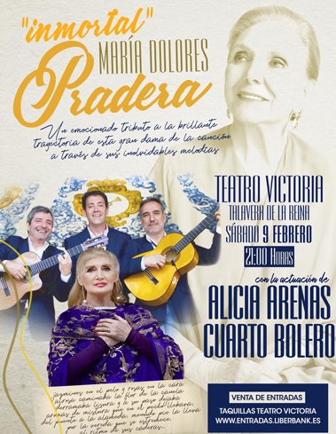 El grupo Cuarto Bolero de Talavera de la Reina rendirá un homenaje a la cantante María Dolores Pradera con un concierto el día 9 de febrero, a las 21.00 horas, en el teatro Victoria, en el que contará con la artista Alicia Arenas.