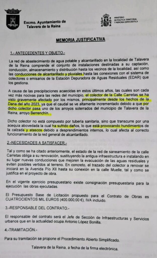 "Se trata de la memoria justificativa del expediente que justifica la renovación urgente del colector, aprobado en el día de ayer en Junta de Gobierno Local", expone el PSOE sobre este documento que recoge que "el colector de la calle Carretas se ha visto gravemente afectado por los mismos, principalmente desde los hechos de la DANA del año 2023, ya que el caudal se ve altamente incrementado debido a que por dicho colector pasa […] el arroyo Berrenchín".