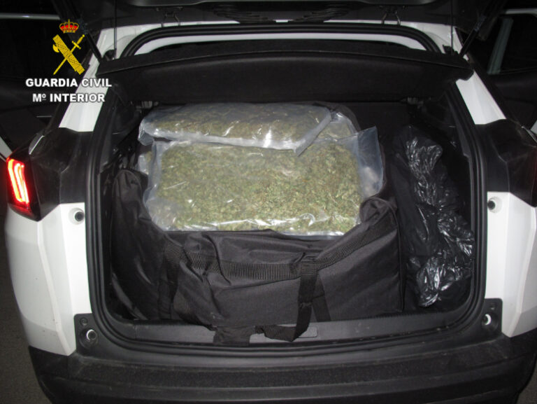 El conductor y único ocupante fue identificado y la can del Servicio Cinológico, de nombre Kenia, señaló varias bolsas de viaje en los asientos traseros como posibles puntos donde pudiese encontrarse algún tipo de droga. En su registro, los guardias civiles hallaron una sustancia verde, concretamente marihuana, repartida en varios paquetes que arrojaron un peso exacto de 64,8 kilogramos.
