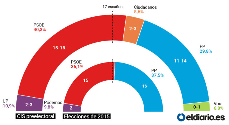 Ciudadanos, que en 2015 se quedó fuera, esta vez sí lograría superar las barreras que establece el Estatuto de Autonomía. Con una estimación del 8,6% de los votos, el CIS le concede también dos o tres diputados.
