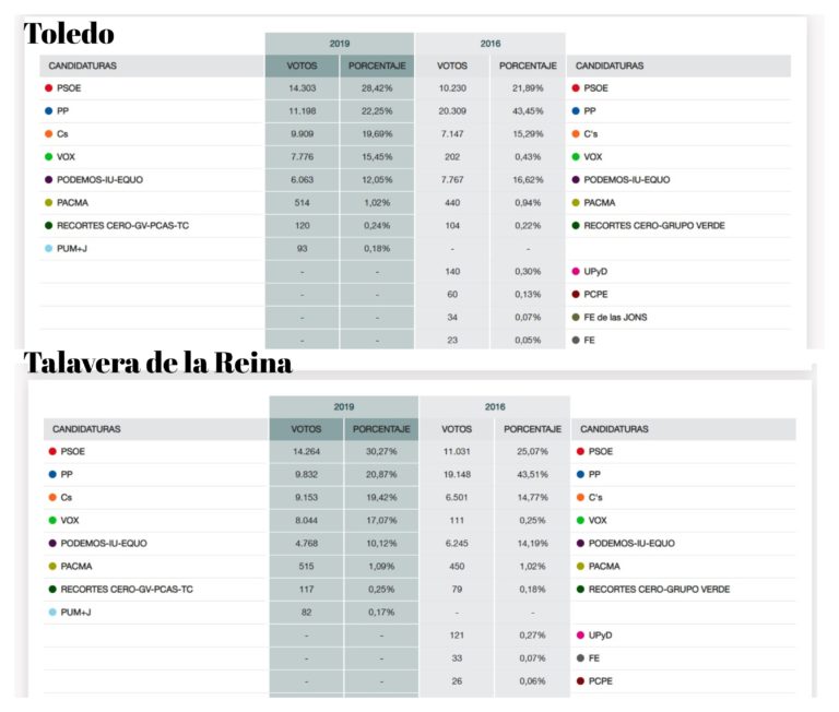 Aunque en el conjunto del país el voto del tripartito de derechas que buscaban aunar los líderes de PP y Ciudadanos, Pablo Casado y Albert Rivera, no alcanzó la suma necesaria, en las principales ciudades de la provincia de Toledo sí que alcanzaría en una hipotética repetición de resultados de cara a los comicios municipales.