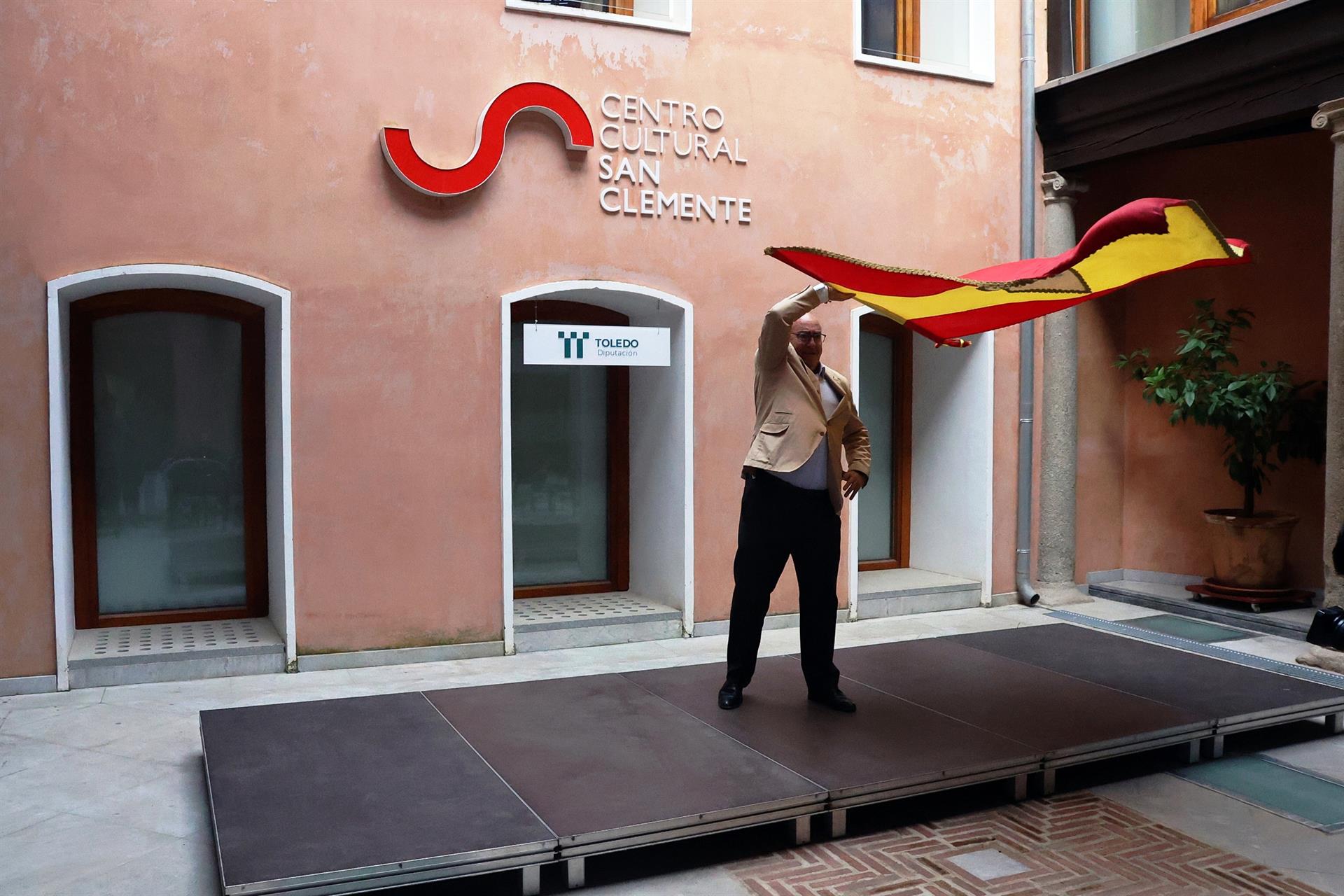 Tras la rueda de prensa, se ha ofrecido una exhibición del baile de la bandera que protagoniza 'El Tinaní' de Quismondo, siendo bailada la bandera por el propio alcalde del municipio y diputado provincial, José Eugenio del Castillo.